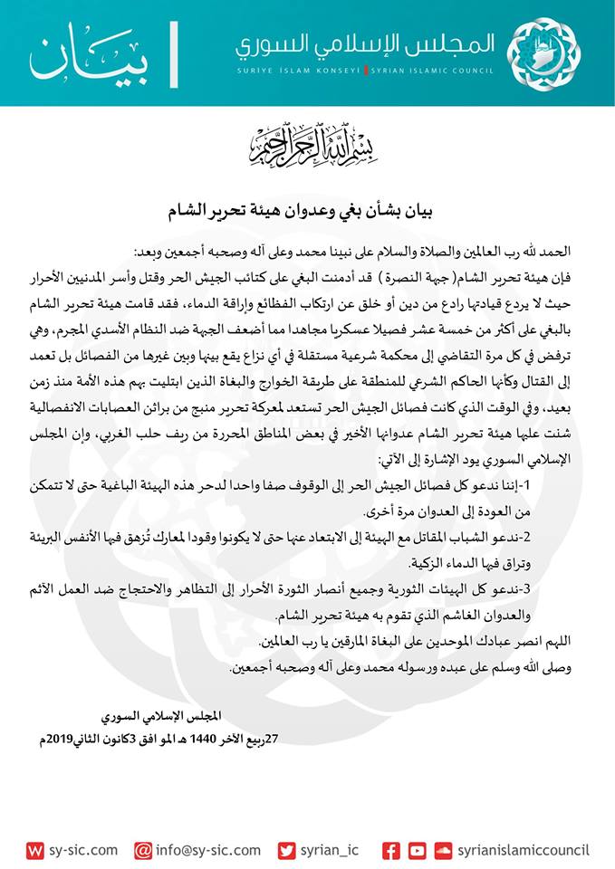 أصدر المجلس الإسلامي السوري يوم الخميس 27 ربيع الآخر 1440 هــ الموافق 3 كانون الثاني 2018م بيانًا استنكر فيه بغي وعدوان (هيئة تحرير الشام) على (حركة الزنكي) إحدى مكوّنات (الجبهة الوطنية للتحرير)، واستيلاءها على مساحات واسعة كانت خاضعة لسيطرة (الزنكي) أهمّها مدينة (دارة عزة) و(جبل الشيخ بركات) الاستراتيجي؛ الأمر الذي دعا (الجبهة الوطنية للتحرير) إلى إعلان النفير العام ضدّ (هيئة تحرير الشام)، وتوسّع دائرة الاشتباكات في عدّة مناطق في إدلب وريف حماة.