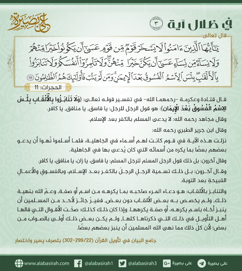 قال قتادة وعكرِمة -رحمهما الله- في تفسير قوله تعالى: {وَلَا تَنَابَزُوا بِالْأَلْقَابِ بِئْسَ الِاسْمُ الْفُسُوقُ بَعْدَ الْإِيمَانِ}: هو قول الرجل للرجل: يا فاسق, يا منافق, يا كافر.
